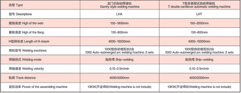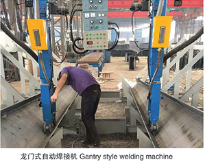 龙门式焊接机具有A型龙门式自动焊接机和T型双悬臂式自动焊接机两种类型:采用交流变频器控制,运行平稳可靠,并具有快速返程功能;跟踪导弧机构为三轴跟踪,确保正确对中焊缝不偏弧;主机与焊机实行一体化联动控制,并配有焊剂自动输送回收系统,操作方便效率高。T型双悬臂式自动焊接机一次可同时加工二根型钢,且大型H型钢的腹板高度不受主机限制。